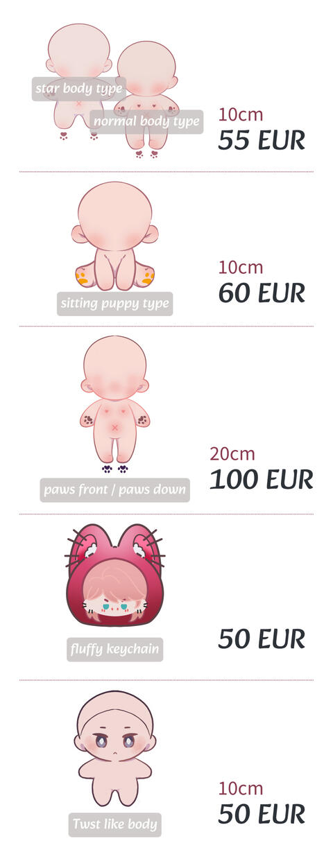 Design I do not make doll designs separately. We will be building the design together with you to achieve the best look of your plushie. While in the design phase, please pay more attention to DMs as we will be heavily communicating on everything. In case you have examples of plushie faces which you like - do not hesitate to share them. Doll The plushie will be carefully packed