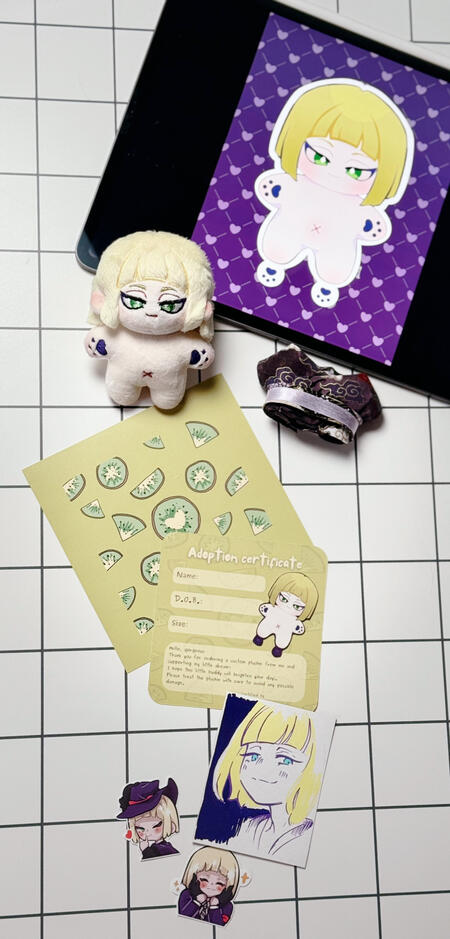 Extras Every plushie will come with bonus stickers and hand-drawn card of your character illustrated by me. I will be also including little local sweets too, please, don’t be surprised if i ask about your food preferences (´• ω •`)